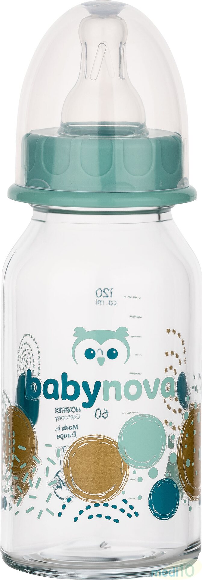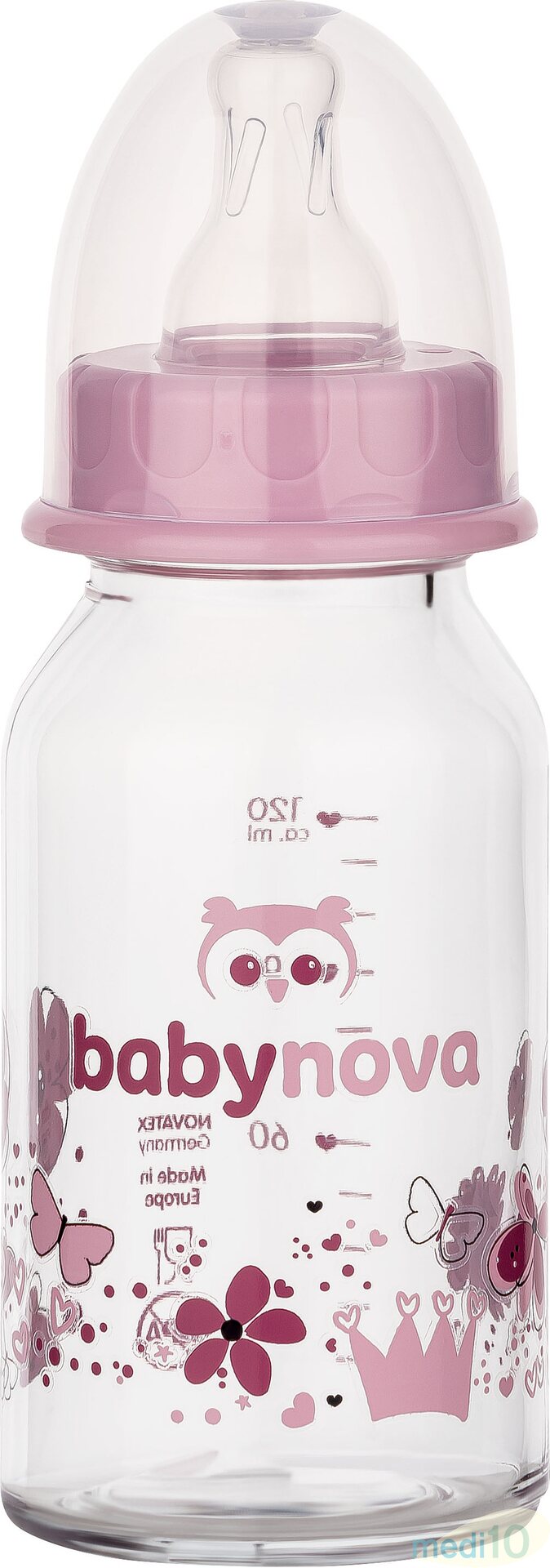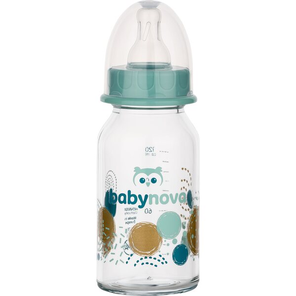 Iloisin, koristeluin varustettu BabyNova-lasinen tuttipullo on tukeva ja turvallinen käyttää. Lasinen tuttipullo on valmistettu iskunkestävästä erikoislasista